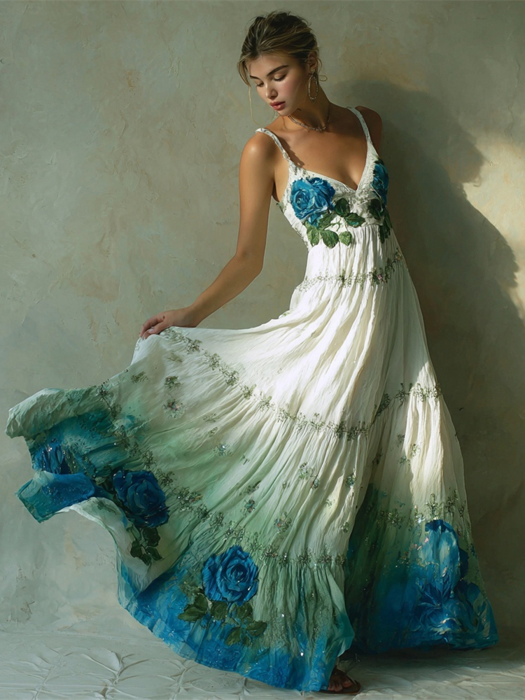 Elegant Boho Floral Gradient Embroidery Women's Spaghetti Strap Maxi Dress
