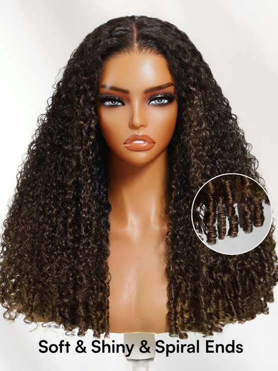 Ombre Chestnut Brown Burmese Curly with Full Finger Coil Ends Wig 7x5 Bye Bye Knots