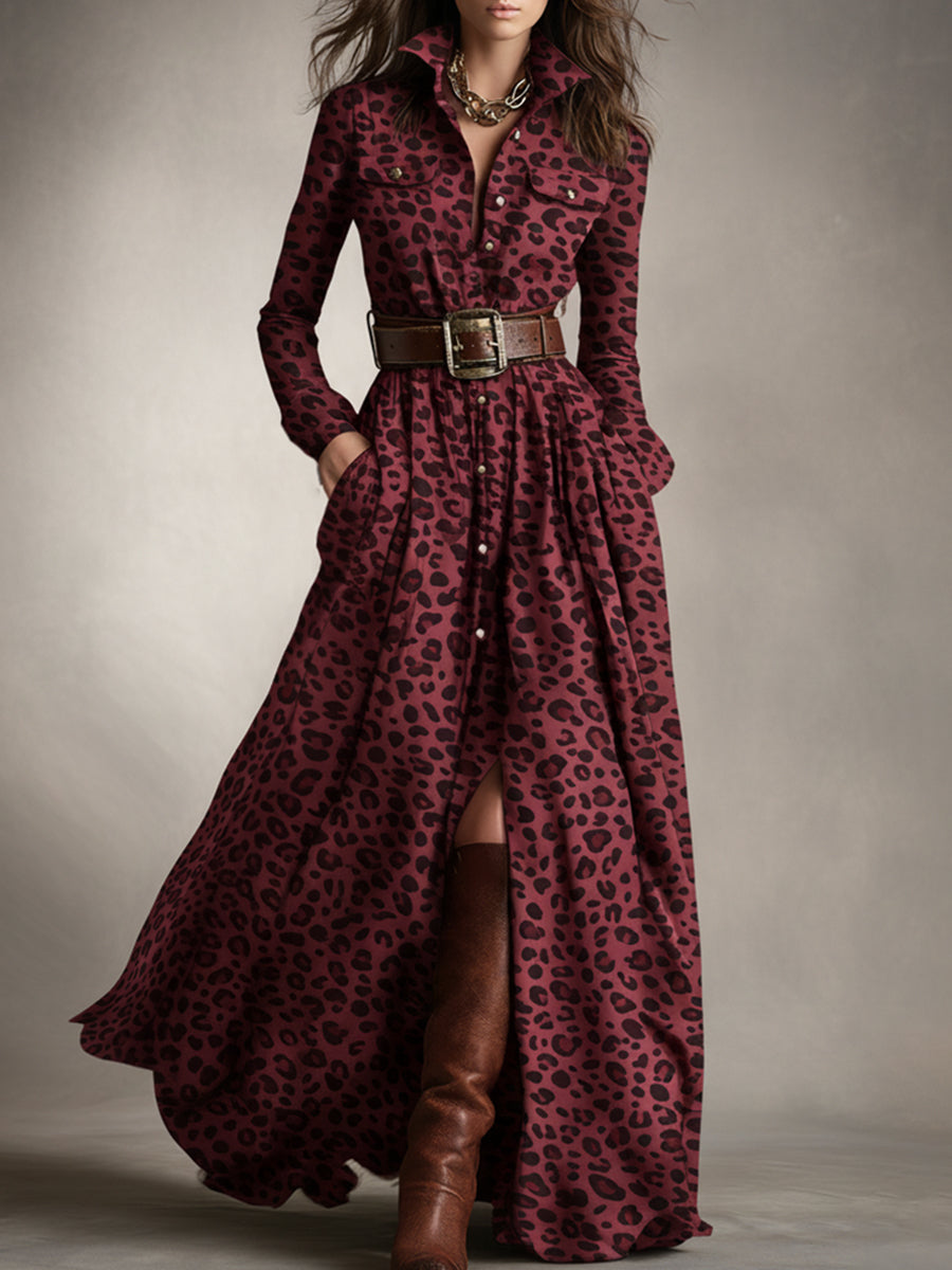 Retro Ethnic Style Raspberry Red Leopard Print Faux Suede Maxi Dress