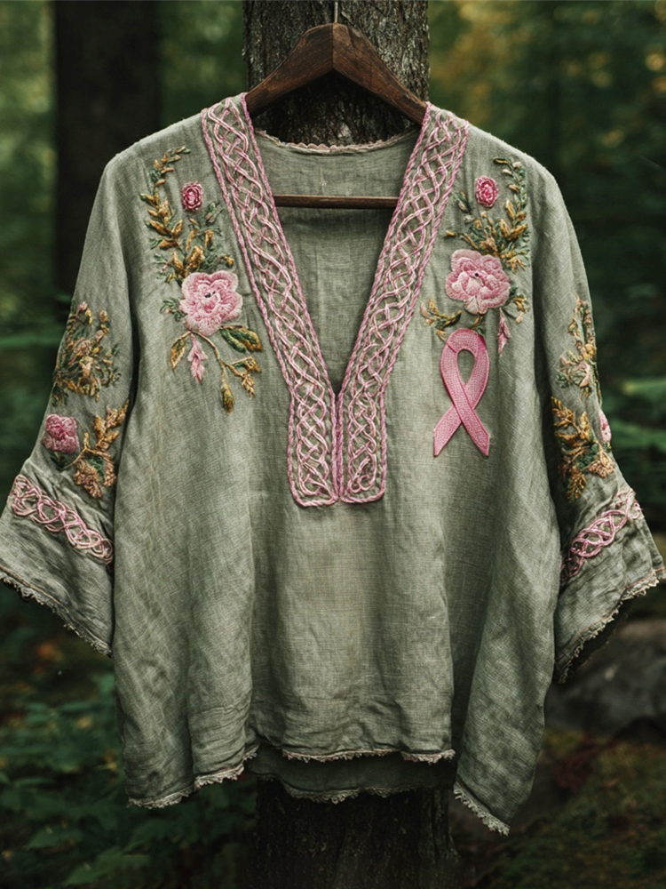 Vintage Celtic Knot Floral Embroidery Pink Ribbon Awareness Women's Linen V-neck Shirt
