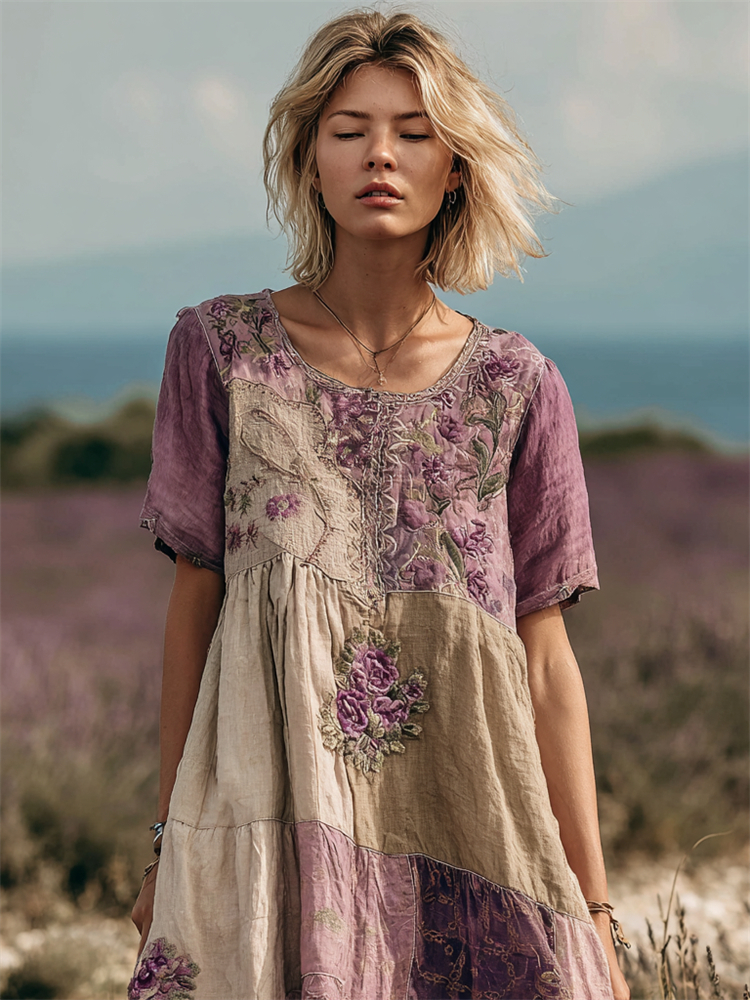 Vintage Lavender Roses Embroidered Cottage Patchwork Linen Dress