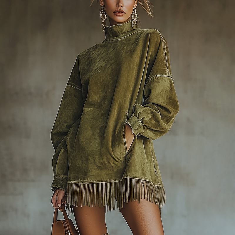 This dress combines Western retro charm, cozy suede fabric, and modern design details. With its elegant high-neck and trendy fringed hem, it’s perfect for creating standout looks that are both comfortable and stylish during fall and winter.