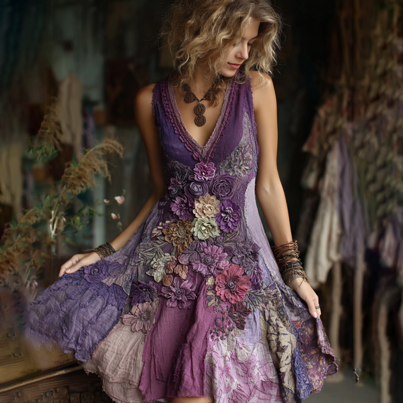 Women's Vintage Floral Splicing Cotton And Linen Tank Dress